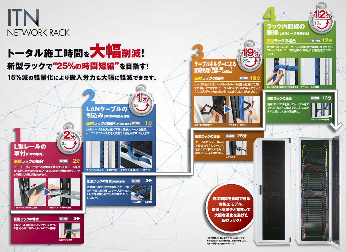 カワムラ 情報通信機器収納ラック ネットワークラックITN トータル施工時間を大幅削減、新型ラックで25%の時間短縮を目指す。